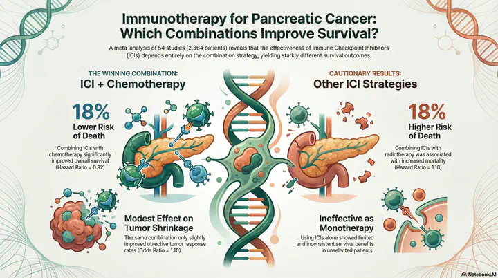 This systematic review and meta-analysis evaluates the efficacy of immune checkpoint inhibitors (ICIs) in pancreatic ductal adenocarcinoma (PDAC), analyzing 54 studies with 2,364 participants. We assessed objective response rate (ORR), progression-free survival (PFS), and overall survival (OS) across ICI monotherapy, ICI combined with chemotherapy, and ICI combined with radiotherapy. Key findings reveal that ICI + chemotherapy significantly improves OS (HR 0.82, 95% CI: 0.78–0.87), while ICI + radiotherapy is associated with increased mortality risk (HR 1.18, 95% CI: 1.04–1.34). Biomarker-selected populations (high TMB, dMMR/MSI-H) show enhanced responses.